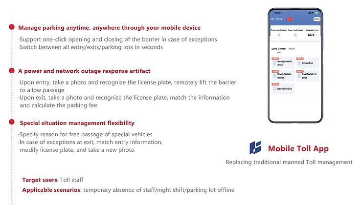 The Mobile Toll App is designed to be a power and network outage response artifact. Upon entry, it takes a photo and recognizes the license plate, remotely lifting the barrier to allow passage. Upon exit, it takes a photo and recognizes the license plate, matches the information, and calculates the parking fee.