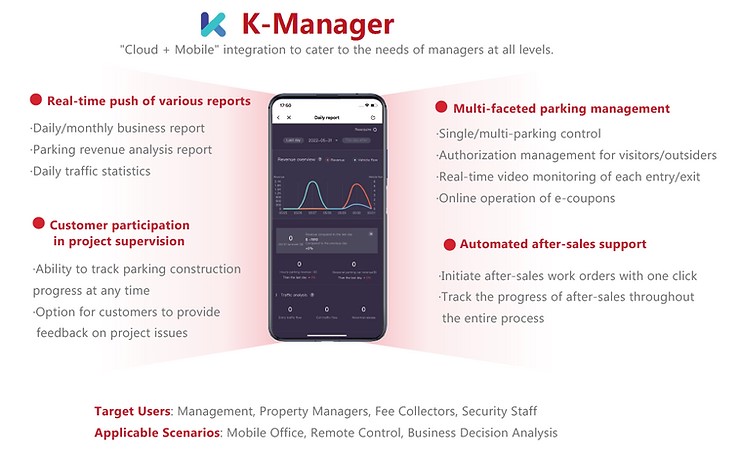Both K-Manager and Mobile Toll App are targeted towards management, property managers, fee collectors, and security staff. They are applicable in scenarios such as mobile office, remote control, and business decision analysis.
